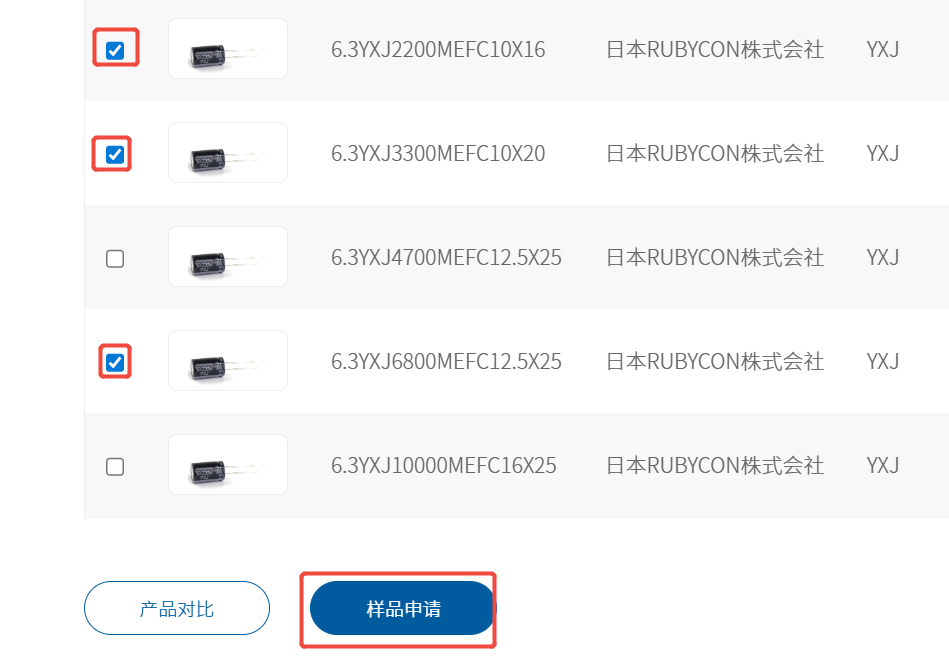 请点击“产品中心”->“产品类别”中的页面,勾选要申请的样品,然后点击“样品申请”按钮,如下图所示: