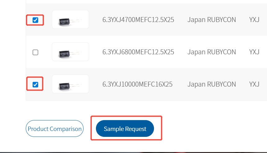 Please click on the "Product Center" -> "Product Categories" page, select the samples you wish to apply for, and then click the "Sample Application" button, as shown in the following picture: